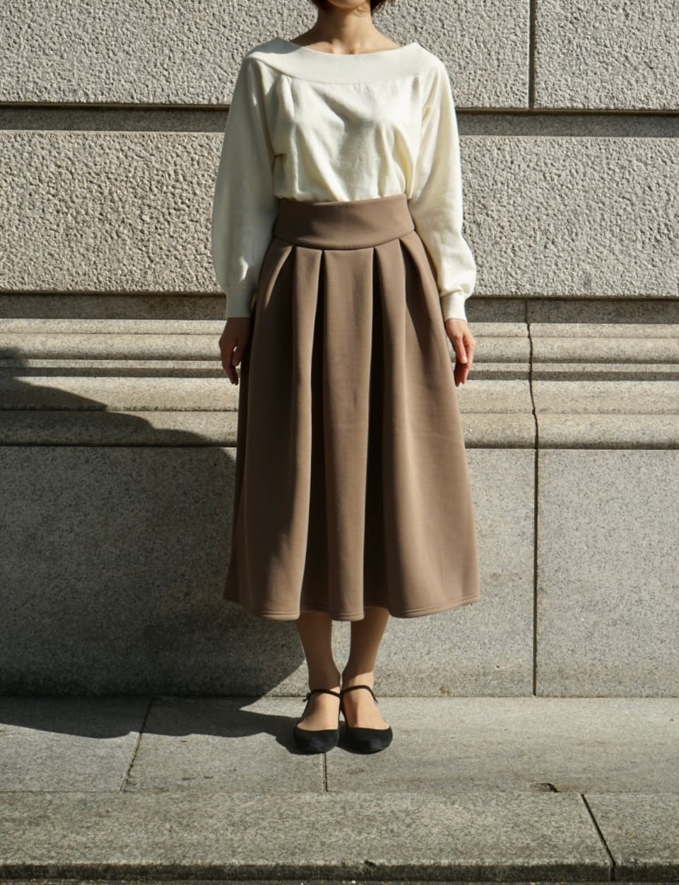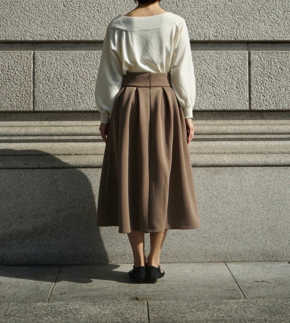 前後に入ったタックとたっぷりの生地量によりリッチなボリューム感を楽しめます。
